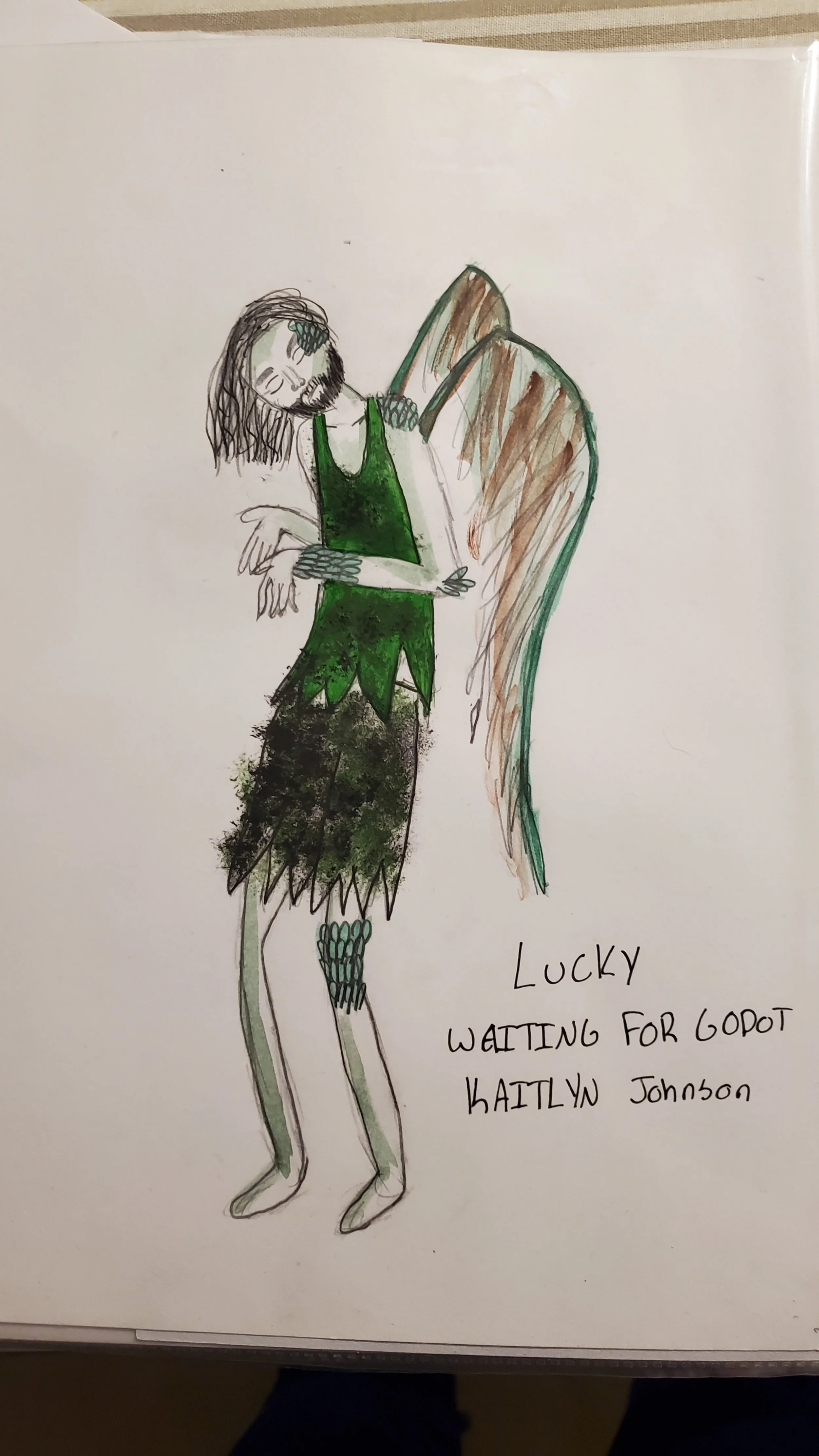Lucky: older male, tries to take care of pozzo but is scared and timid. Has tiny wings and feathers growing on him yet cannot fly, excretes an acidic saliva and a green tint to skin, tattered versions of explorer gear